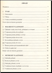 Jednotlivé kapitoly této učebnice obsahují následující matematické poznatky: polohové vlastnosti, metrické vlastnosti, zobrazení a tělesa. Kniha obsahuje vysvětlení jednotlivých částí, příklady i úkoly k opakování. V každé kapitole také podnikneme výlet do historie geometrie. V závěru knihy nalezneme výsledky úloh a seznam používaných matematických symbolů.
