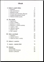 * Keltové a jejich dějiny (Prameny, Kdo byli Keltové, Keltská Evropa, Živoření pod nadvládou Římanů, Problém křesťanských Keltů, Moderní keltské jazyky) * Život Keltů (Společnost, Formy osídlení, Rolnictví a výživa, Řemesla a výrobní techniky, Umění a zlato, Obchod a peníze, Keltové a sůl, Řeč a písmo) * Kult a mytologie (Druidové, Keltská božstva, Kultovní místa a rituály) * Keltové v esoterice * Asterix – statečný Kelt * Dodatek (Chronologie, Seznam další literatury, Seznam vyobrazení)