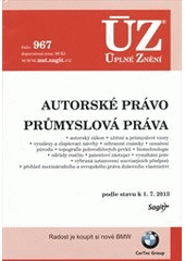 Kompletní soubor 34 předpisů v úplném znění včetně vybraných ustanovení souvisejících předpisů. Publikace mj. obsahuje autorský zákon, zákon o ochraně průmyslových vzorů, o užitných vzorech, o ochranných známkách, o vynálezech a zlepšovacích návrzích, o ochraně topografií, o patentových zástupcích, o ochraně práv k odrůdám, o ochraně olympijských symbolik a další. Změnami bylo dotčeno několik předpisů, z nichž nejpodstatněji autorský zákon. Všechny novely jsou zvýrazněny tučně. Součástí publikace jsou přehledy mezinárodního práva duševního vlastnictví vázaného Českou republikou a práva duševního vlastnictví EU. Podle stavu k 1. 7. 2013.