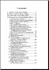 Stručný biografický přehled. Praha v době Franze Kafky. Kafkova rodina. Průvodce 38 pražskými lokalitami spjatými s jeho životem a dílem. Kafkovy procházky Prahou a jeho oblíbená místa. Praha a Čechy v Kafkově díle. Cestování po Čechách a pobyt v dalších českých městech. Doplněno řadou citací z autorova díla a korespondence a 222 černobílými fotografiemi. Poznámky. České a německé a ruské ekvivalenty názvů hlavních míst zmiňovaných v textu. Bibliografie. Plánek historického centra s označením všech 38 uvedených míst.