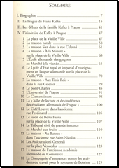 Stručný biografický přehled. Praha v době Franze Kafky. Kafkova rodina. Průvodce 38 pražskými lokalitami spjatými s jeho životem a dílem. Kafkovy procházky Prahou a jeho oblíbená místa. Praha a Čechy v Kafkově díle. Cestování po Čechách a pobyt v dalších českých městech. Doplněno řadou citací z autorova díla a korespondence a 222 černobílými fotografiemi. Poznámky. Francouzské, české a německé ekvivalenty názvů hlavních míst zmiňovaných v textu. Bibliografie. Plánek historického centra s označením všech 38 uvedených míst.