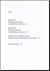 Nové, rozšířené vydání zásadních rozhovorů profesora univerzity v St. Louis Harryho Jamese Cargasse a literárního historika Michaela Bauera s českým spisovatelem a publicistou. První rozhovor, pořízený v roce 1992 a publikovaný o rok později v knize Witnesses of Catastrophe (Svědkové katastrofy), představuje Lustiga jako vnímavého svědka největší lidské tragédie 20. století. V dialogu s Michaelem Bauerem, publikovaném v roce 1998 v časopise Tvar, zastihujeme Lustiga o několik let staršího a naléhavěji uvažujícího o smyslu a poslání literárního díla. Sherwinův esej je nejstarší – vznikl už v roce 1979 –, avšak otázky, které si klade a na něž se pokouší najít odpověď, neztratily nic na své aktuálnosti. Knihu doprovázejí fotografie Lustigovy dvorní portrétistky Petry Růžičkové.
