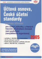 SVOBODOVÁ, Jaroslava. Účtová osnova a České účetní standardy pro účetní jednotky, u kterých hlavním předmětem činnosti není podnikání (nevýdělečné organizace): vyhláška č. 504/2002 Sb. s komentářem, České účetní standardy s příklady účtování, zákon č. 563/1991 Sb., o účetnictví. Olomouc: Anag, 2005. 224 stran. Účetnictví.