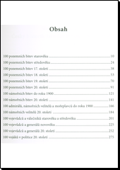 Kniha obsahuje souhrn kapitol týkajících se pozemních bitev starověku, středověku, 17., 18., 19. a 20. století a dále námořních bitev do roku 1900 a ve 20. století. Další část je věnována osobnostem, tedy admirálům a námořním velitelům do r. 1900 a ve 20. století, vojevůdcům starověku, středověku a novověku, vojevůdcům 20. století a nakonec též vojákům v politice 20. století.