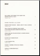 Editor rozdělil příspěvky poměrně širokého okruhu autorů do tří celků. Po úvodní stati věnované Karlu Risingerovi a jeho dílu následují příspěvky zkoumající hudební strukturu resp. její jednotlivé složky. Druhou část reprezentují práce týkající se hudební analýzy a její metodologie a třetí okruh se soustřeďuje na pedagogické aspekty hudebně teoretických dicsciplín, které jubilující autor rozpracoval v rámci svého pedagogického působení. Tabulky, nákresy a hudební příklady v textu.