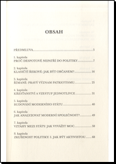 Kapitoly přibližují základy politologie a dějiny politiky.Práce z pera profesora politologie zachycuje vývoj politického myšlení v antice, ve středověku a především v období novověku. Zaobírá se rovněž mezinárodními vztahy, moderní společností, politickými stranami, základními politickými ideologiemi, vybranými formami vlády a pokouší se o rozbor nejdůležitějších úkolů moderních politiků. V závěru se snaží odpovědět na otázku, zda politika přežije 21. století.