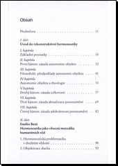 V české literatuře máme dnes již více prací pojednávajících o problematice hermeneutiky. Jsou většinou inspirována dílem německého filosofa H.-G.Gadamera a zakládají se na myšlenkovém odkazu Gadamerova učitele, M. Heideggera. Takovému typu hermeneutiky se říká integrativní. Integrativní hermeneutika vyúsťuje v historický relativismus. Zcela stranou zájmu u nás dosud zůstalo jiné pojetí hermeneutiky, jemuž se říká rekonstruktivní. Rekonstruktivní hermeneutika navazuje na myšlenkový odkaz italského autora E. Bettiho. Betti vychází po filosofické stránce z realistických principů a setrvává díky tomu, na rozdíl od integrativní hermeneutiky, na půdě historického objektivismu. Kniha obsahuje přístupně napsaný výklad základů rekonstruktivní hermeneutiky a poskytuje čtenáři vedle toho i možnost seznámit se v českém překladu s jedním ze základních Bettiho spisů.