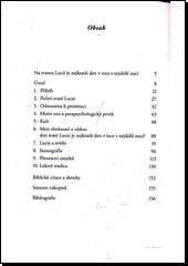 Podrobný popis úcty ke svaté Lucii napříč staletími a uměleckými žánry: v hudbě, v literatuře, ve výtvarném umění. Stopy jejího života jsou epochální. Autorka s vědeckým klidem analyzuje dobové legendy světice. Lucie je patronkou lidí, kteří mají problémy se zrakem. Ale též těch, kteří propadli neřešitelné závislosti na drogách a jiným nabídkám.