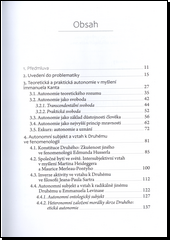 Kniha se věnuje vztahu autonomie a jinakosti, a to na základě dialogu mezi Kantovou filosofií a fenomenologií. Pojem autonomie je představen na základě Kantova myšlení se zaměřením na jeho prakticko-etickou filosofii.Přičemž lze rozlišit několik významů autonomie: autonomii jako sebezákonodárství, jako vrchní mravní princip, jako svobodu, jako základ důstojnosti člověka. Bylo by ale chybou představovat si autonomní subjekt jako izolovanou entitu. Autonomie je záležitost vztahová a žije z určitých podmínek. Rozpracování vztahového pole autonomie je tématem fenomenologické části, a to pomocí teorií intersubjektivity. Jedná se o rozvrhy, které popisují vztah k Druhému vycházejíce z apriorního, společného základu: z původního a intersubjektivně sdíleného světa u Husserla, ze vzájemného propletení u Merleau-Pontyho nebo ze spolu-bytí u Heideggera. Alternativní model Levinasův a Sartrův zdůrazňuje naopak radikální oddělení mezi subjektem a druhým člověkem. Druhý stojí v bezprostředním vztahu k subjektu a radikálně zpochybňuje jeho autonomii.