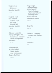 Feigl, německojazyčný výtvarník židovského původu, se narodil v Praze v generaci umělců, jejichž dílo se formovalo na začátku 20. století. Po pražských začátcích přesídlil do Berlína; po zhoršení politické situace se vrátil roku 1933 do Československa, odkud uprchl před nacistickou okupací roku 1939 do Anglie, kde začal znovu budovat svoji uměleckou dráhu. Publikace, která doprovází výstavu v Chebu a Českých Budějovicích, představuje spletitou životní i uměleckou dráhu umělce, který se vyjadřoval prostřednictvím celé řady výtvarných médií (olejomalba, akvarel, kresba, litografie, suchá jehla, lept či dřevořez). V závěru obsahuje knížka chronologický přehled Feiglových životopisných dat a bibliografii.