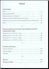 Předkládaná studie je definitivním soupisem přísedících komorního soudu v letech 1527–1620. Vychází ze starší edice Václava Schulze z roku 1904 a z prezencí přísedících zapisovaných do register komorního soudu, uložených v Národním archivu. Komorní soud se v předbělohorském období řadil na třetí místo za soudy zemský a dvorský. Jeho kompetence nebyly přesně stanoveny, překrývaly se s kompetencemi ostatních soudů. V předbělohorském období byl komorní soud personálně propojený se soudem dvorským. V roce 1534 ho stabilizoval král Ferdinand I. vydáním tzv. Zřízení o komorním, hejtmanském a dvorském soudu. Soupis přísedících je rozdělen do dvou bloků. V prvním jsou uvedeni přísedící za vlády Habsburků (1527–1619), v druhém přísedící za vlády Fridricha Falckého (1619–1620). Vnitřně jsou oba bloky rozděleny na přísedící v panském stavu a přísedící v rytířském stavu. Struktura záznamu o každém přísedícím je: a) příjmení a predikát, popř. jen predikát, b) počet přísedících v rámci jednoho rodu a jejich kategorie, c) křestní jméno, d) životopisná data, e) domicil, f) datum jmenování, g) datum složení přísahy, h) datum instalace, ch) datum/data účasti na jednotlivých soudních zasedáních, i) informace o individuální kariéře, j) datum rezignace a propuštění.
