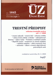 Publikace obsahuje texty právních předpisů k 1. 1. 2026, kdy dochází k zásadním změnám trestního zákoníku a trestního řádu (např. snížení některých druhů trestů, změkčení podmínek pro pěstování a přechovávání marihuany, zjednodušení ukládání podmíněných trestů, rozšíření počtu předsudečných trestných činů, zavedení tzv. dětského certifikátu pro práci s dětmi a řada dalších změn). Dále se mění zákon o obětech trestných činů, zákon o trestní odpovědnosti právnických osob, zákon o výkonu vazby, zákon o výkonu trestu odnětí svobody a řada dalších zákonů a prováděcích předpisů. Publikace obsahuje novelizované znění 26 předpisů rozdělených do sedmi kapitol: trestní předpisy, výkon trestu odnětí svobody, zabezpečovací detence, výkon vazby, Probační a mediační služba, oběti trestných činů, rozhodnutí prezidenta republiky o amnestii. Poslední změny všech předpisů jsou vyznačeny tučným písmem, odkazy na související předpisy jsou plně citovány.