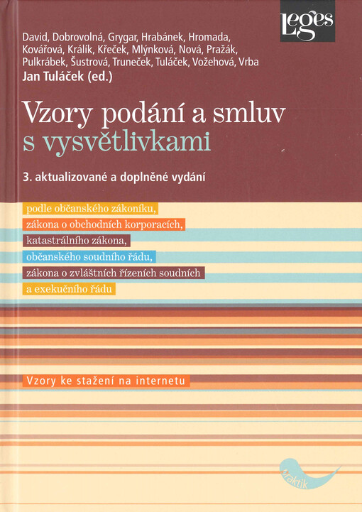 DAVID, Jiří. Vzory podání a smluv s vysvětlivkami: podle občanského zákoníku, zákona o obchodních korporacích, katastrálního zákona, občanského soudního řádu, zákona o zvláštních řízeních soudních a exekučního řádu. 3. aktualizované a doplněné vydání. Praha: Leges, 2022. xxx, 850 stran. Praktik.