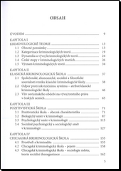 Monografie představuje základní kriminologické teorie, školy a proudy v dobovém kontextu. Podává přehledný a srozumitelný výklad hlavních pojmů a uvádí čelné představitele jednotlivých teorií, které plasticky zasazuje do jejich rodinného prostředí, doby a díla. Ač jsou kriminologické teorie zařazeny do určitých logických skupin, autor při jejich výkladu postupuje v zásadě podle historického hlediska, tedy od klasické kriminologické školy po současnost. Práce rozhodně neobsahuje úplný výčet zejména současných kriminologických teorií, ovšem autorem vybrané teorie znamenaly či znamenají trvalé obohacení kriminologického myšlení. Publikace může být užitečná nejen pro akademiky, studenty, legislativce či pracovníky v systému trestního soudnictví, ale i pro všechny zájemce o kriminologii, trestní právo, sociologii, pedagogiku a další související společenské vědy.