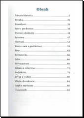 Kniha ukazuje českou mentalitu, národní identitu, povahu, kulturu. Zkoumá také postoje Čechů, jejich zásady, hodnoty, zvyky a tradice, jaké uznávají společenské způsoby chování, čím se zabaví, co jí a pijí atd.