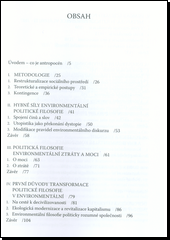 Kniha je pokus o znázornění hlavních principů nové politické filosofie odpovídající parametrům antropocénu, tj. epoše, kdy negativní vliv člověka na přírodu dosáhl stupně, který převyšuje vliv geologických sil. Lidstvo se stalo dominantní silou ovlivňující všechny složky planetárního ekosystému (biosféru, hydrosféru, atmosféru, kryosféru, litosféru) a jeho činnost s sebou přináší problémy, které se dotýkají sociální a politické sféry. Úvod do environmentální politické filosofie tyto problémy znázorňuje, zkoumá jejich příčiny a jevovou formu a hledá možnosti jejich detailního porozumění. Kniha neformuluje levná populistická řešení ani neslouží jako politický program. Naopak, přináší filosofické analýzy ekologicky, sociologicky, politologicky a ekonomicky podmíněného materiálu s cílem dosáhnout komplexního poznání sociálně-politické situace antropocénu.