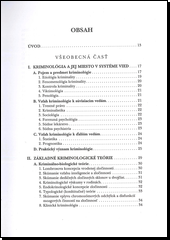 Publikácia predkladá ucelený výklad základných problémov kriminológie ako vedného odboru a študijného predmetu vchádzajúceho do mnohých vysokoškolských spoločenskovedných študijných programov. Na jej vypracovaní sa podieľali poprední odborníci zaoberajúci sa kriminologickými aspektmi kriminality a jej kontroly. Jej cieľom je vybaviť čitateľa elementárnymi poznatkami nevyhnutnými pre štúdium ďalších kriminologických a odborne náročnejších prameňov. Tomu zodpovedá aj obsah publikácie, ktorá v prvej, všeobecnej časti objasňuje predmet kriminológie ako vedného odboru, systém jej teórie a metodológie, jej páchateľov a obete. V druhej, špeciálnej časti sú charakterizované osobité kategórie a formy kriminality (násilná, majetková, mravnostná, hospodárska, drogová, počítačová a organizovaná kriminalita). Je určená najmä študentom právnych a ďalších spoločenskovedných odborov, ale aj širšej odbornej a laickej verejnosti.