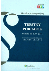 Úplné znenie zákona č. 301/2005 Z. z., Trestný poriadok, účinné k 1.9.2011 s ustanoveniami účinnými k 1.10.2011 a k 1.11.2011. je ďalšia publikácia z edície "Aktuálne právne predpisy." Publikácie edície "Aktuálne právne predpisy" sa vyznačujú viacerými osobitosťami. K vybraným ustanoveniam, ktoré nie sú v právnom predpise pomenované, sú uvedené pre uľahčenie orientácie názvy v hranatých zátvorkách, ktoré sú určené redakciou. Tie ustanovenia, ktoré nadobudli účinnosť k 1.9.2011, sú označené a okomentované tak, aby sa vedel čitateľ zorientovať v zmenách. Ak niektoré ustanovenia nadobúdajú účinnosť v nasledujúcich mesiacoch, v prípade Trestného poriadku sú to ustanovenia účinné k 1. októbru a 1. novembru 2011, publikácia obsahuje aj tieto znenia. V neposlednom rade sa na okraji každej strany nachádza priestor vyhradený na poznámky. Publikácia je určená najmä aplikačnej praxi (sudcom, prokurátorom, advokátom, príslušníkom Policajného zboru), ale i študentom právnických fakúlt.