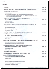 Je zde uvedeno plné znění zákona o důchodovém pojištění, dále právní předpisy,které se zabývají životním minimem, různými druhy jednorázových i jiných příspěvků zdravotně postiženým občanům, dále služby sociální péče, předpisy týkající se vzdělávání postižených dětí, problematika zaměstnání, náhrad škody, problematika bydlení aj. Na závěr jsou připojeny důležité informace týkající se právní poradenské pomoci postiženým občanům a vzory některých podání.