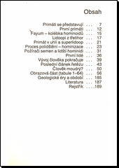 Přehled vývoje od prvních primátů až po rod Homo, doplněný jejich zobrazením na barevných ilustracích.