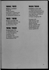Monografie popisuje dějiny pražské architektury od přelomu 19. a 20. stol., kdy do města proniká architektonická moderna (secese), přes originální, ve světě zcela ojedinělou epizodu pražského architektonického kubismu, až po nástup puristické a funkcionalistické nové architektury po první světové válce, její souboj s konzervativními stylovými směry ve dvacátých letech a konečně její pozvolný rozklad po polovině 30. let. Potřebnou pozornost věnuje práce i pražskému urbanismu daného období a společenskému pozadí pražských architektonických směrů první poloviny 20. stol. Kromě toho se autor pokouší konfrontovat dobové architektonické teorie s dobovou architektonickou praxí a zároveň zjistit, jaký mají na vývoji pražské architektury první poloviny 20. stol. konkrétní podíl jednotlivé tvůrčí osobnosti. - Předpokladem práce bylo provedení podrobného průzkumu pražské architektury přímo v terénu (na území Velké Prahy v jejích hranicích z r. 1920), který byl doplněn obsáhlým studiem archivních dokumentů městských stavebních úřadů, pozůstalostí architektů i dobové odborné literatury. Výsledkem tohoto výzkumu je i závěrečný Adresář staveb řazený abecedně podle ulic (adresa a číslo popisné objektu, jméno architekta, název nebo typ domu, datace, odkaz na stranu s vyobrazením, pokud je součástí knihy), na němž autor spolupracoval s historikem architektury Zdeňkem Lukešem.