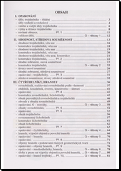 Žáci se dozvědí, jak určit shodnost obrazců, jak využít poznatků o úhlech, co jsou pravidelné a nepravidelné mnohoúhelníky, co je těžnice a těžiště, osová a středová souměrnost. Množství příkladů je z běžného života. Navíc sešit obsahuje příklady shrnující učivo, rébusy, obtížnější příklady rozšiřující učivo, ústní testy.
