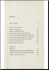 Stati a přednášky obsahují formulace základních úkolů restaurování jak z hlediska výtvarného a technologického, tak i z pohledu estetického, etického a filozofického. Autor vymezuje a vysvětluje pojmy: restaurování, obnova, oprava, nahrazování, rekonstrukce, retuše, domalba, přemalba i falzum. Je obhájcem komplexního přístupu při restaurování uměleckého díla. Restaurátor by měl provést důkladný průzkum i registraci situace, místa, proniknout do jednotlivých časových vrstev, rozpoznat jejich funkci v daném prostředí a souvislostech, a citlivě přistoupit k tzv. uměleckému restaurování. V dodatku jsou uvedeny zásady a pokyny pro restaurování památek a starožitností včetně Charty restaurování.