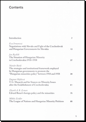 Kolektivní monografie dává nahlédnout do způsobu řešení menšinové otázky v Československu a Maďarsku v letech 1918-1939. Kolektiv maďarských a českých historiků přináší kritickou analýzu meziválečné menšinové politiky v obou zemích. Objasňuje etnopolitické následky rozpadu habsburské monarchie a zdůrazňuje iluzornost snah vytvořit etnicky čisté národní státy v multietnickém středoevropském prostoru. Pozornost je soustředěna na koncepce národní politiky jak ve vztahu k minoritám, tak ve vnější národní politice a politické propagandě. Řešení národní problematiky je zkoumáno z pohledu významných osobností i v celkovém kontextu meziválečných středoevropských etnických problémů. Naznačeny jsou též možné alternativy mezinárodního řešení středoevropských menšinové problematiky. Kniha obsahuje též dokumenty o mezinárodních závazcích Československa, Jugoslávie a Rumunska v rámci mezinárodních menšinových dohod z roku 1919 a dokumenty k poslední kontroverzní diplomatické etapě meziválečných československo-maďarských menšinových a etnopolitických vztahů.