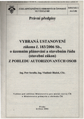 SERAFÍN, Petr. Vybraná ustanovení zákona č. 183/2006 Sb., o územním plánování a stavebním řádu (stavební zákon) z pohledu autorizovaných osob. Praha: Informační centrum ČKAIT, 2006. 15 s. Řada A - Základní knižnice odborných činností ve výstavbě. Právní předpisy, AA.2.06.