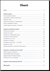 První česká publikace, která přináší informace o největší hazardní karetní hře současnosti. Stručné informace o postupném vývoji pokeru a jeho rozšíření zejména v Americe. Způsob hry a pravidla několika vybraných pokerových her (např. sedmikaretní poker, varianta Texas hold´em či devítikaretní poker). Zmínka o amerických hernách a turnajích, které se odehrávají po celém světě. Nejzajímavější internetové zdroje informací o pokeru a anglicko-český slovníček speciálních výrazů.