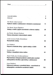 Publikace shrnuje různé aspekty vývoje vztahů dospívajících, kterým nebylo dosud věnováno v tuzemské odborné literatuře mnoho pozornosti. Řada tradičních názorů je revidována a aktualizována, publikace reflektuje změny společensko-historické a kulturní, které mají vliv na průběh a náplň období dospívání. Prezentované studie mají přehledový charakter a autoři do většiny z nich zasazují také výsledky vlastních relevantních výzkumů. Autorský tým je z převážné většiny tvořen pracovníky Institutu pro výzkum dětí, mládeže a rodiny na Fakultě sociálních studií Masarykovy univerzity v Brně.