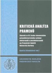 Kritická analýza pramenů: sborník ze IV. česko-slovenského právněhistorického setkání doktorandů a postdoktorandů na Právnické fakultě Univerzity Karlovy. Editorka Kamila STLOUKALOVÁ. Praha: Univerzita Karlova, Právnická fakulta, 2017. 257 stran.