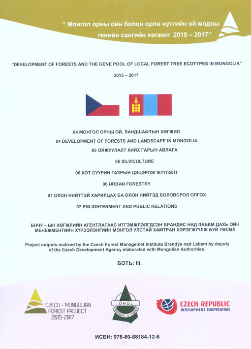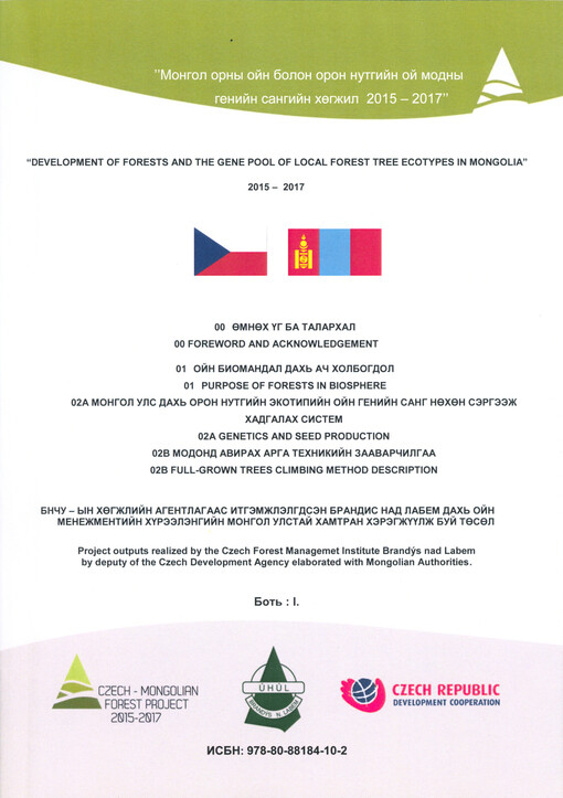 "Mongol orny ojn bolon oron nutgijn oj modny genijn sangijn chögžil 2015-2017" =: "Development of forests and the gene pool of local forest tree ecotypes in Mongolia" 2015-2017. Brandýs nad Labem: ÚHÚL, [2017]. 3 svazky.