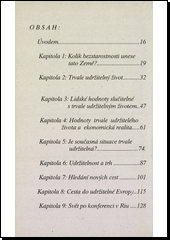 Sociolog Jan Keller se ujal úkolu na základě Vavrouškových textů přiblížit čtenářům jeho analýzu hodnotových orientací moderní společnosti, projekt ekologické spolupráce v rámci Evropy a jeho návrh na restrukturalizaci OSN předložený Konferenci v Rio de Janeiru v roce 1992. Myšlenky, které hájil Josef Vavroušek, neztratily nic na své aktuálnosti. Přesto se o nich dnes příliš nemluví. Jsou přehlušovány stále dokola opakovanými frázemi, jež jakoby byly opisovány ze stále stejných učebnic dějinného optimismu. Toho optimismu, jenž už tolikrát v minulosti pomáhal maskovat naprostou bezradnost.