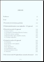 Tento překlad 95 výpovědí M. Luthera přináší mnoho možností studia spisu, který stál na začátku reformace v r. 1517. Druhá kapitola podává pohled na teologické myšlenky M. Luthera, ve třetí kapitole jsou představeny přetrvávající historické problémy.