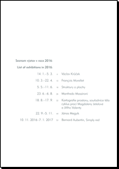 BRUCHÁČKOVÁ ZÁVODNÁ, Vladimíra. Galerie Závodný (Mikulov, Břeclav, Česko). Galerie Závodný 2016 =: Závodný Gallery 2016. Přeložil Petra KORLAAR. [Mikulov]: Galerie Závodný, [2017]. 59 stran.