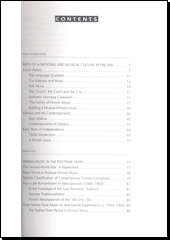 Kolektivní práce vybraných specialistů podává na společensko - historickém pozadí průřez dějinami finské hudby od opery a symfonie k hudbě lidové, pop music, jazzu a rocku. Publikace představuje hlavní finské skladatele a jejich tvorbu, orchestry a sbory, dirigenty a interprety. Knihu doplňují černobílé fotografie, bibliografie a jmenný rejstřík.