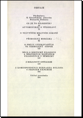 Zahrnuje všechny významnější Bolzanovy stati a projevy týkající se pojetí filozofie, ontologie, etických a sociálně filozofických názorů. Většina prací za řazených do sborníku je v češtině publikována poprvé. Textůmpředcházíúvodní studie, která hodnotí vyznam Bolzanova dila pro vývoj teoretické matematiky, pro dějiny logiky, teorii vědy i pro sociální filozofii.