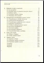 Vysvětluje, co je matice, použití matic k popsání různých situací, sčítání matic, násobení matice číslem a násobení dvou matic. V samostatných kapitolách se zabývá geometrickými transformacemi pomocí matic, algebrou matic a dalším užitím matic. Výklad je doplněn příklady, jejichž výsledky jsou uvedeny na konci knížky.