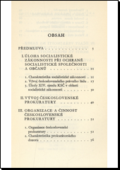 Po charakteristice základních rysů socialistické zákonnosti podává přehled vývoje československého právního řádu a úkolů plynoucích ze XIV. sjezdu KSČ pro tuto oblast. V dalších kapitolách věnuje pozornost vývoji, organizaci a činnosti československé prokuratury a účasti veřejnosti při zabezpečování socialistické zákonnosti.