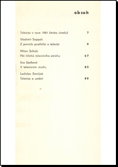 Aktuální knížka, v níž se autoři zamýšlejí nad nejrůznějšími problémy kolem televize. Obsah: V. Sappak: Z prvních postřehů o televizi; M. Schulz: Pět hříchů televizního smíchu; E. Sadková: V televizním studiu; L. Smoljak: Televize a umění.