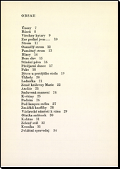 Rýmované i nerýmované verše s náměty přírodními i civilizačními. Verše, které se snaží přírodní jevy postihovat obrazy společenskými (Strom: / U příkopu / zašklebil se na nás jak vandrák / Léta už míjím / tu jeho znetvořenou zkroušenou postavu / hořké třesoucí se listí) a civilizačními (Hořké mléko: / Pampeliška hořící letadlo se řítí k zemi / pak jenom oblak dýmu ...). Verše, které se snaží všední jevy denního života zbavovat všednosti (Lednička:/ Uprostřed krvácí / hluboký talíř zahradních jahod ...).
