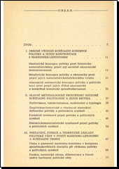 Po analýze obecně výchozí buržoazní politiky autor kriticky hodnotí idealistické přístupy a zdůrazňuje sociálně ekonomickou determinovanost politiky. Seznamuje s hlavními metodologickými prostředky buržoazní politologie, s postavením, funkcí a teoretickými základy buržoazní a marxisticko-leninské politické vědy a konfrontuje teorii buržoazní a marxisticko-leninské politiky s praxí v podmínkách kapitalismu a socialismu.