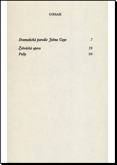 Dvě divadelní hry anglického dramatika, parodisty, satirika a básníka. Doba, jež uplynula od jejich napsání, ničeho neubrala ani divadelní účinnosti, ani společenskému dosahu jak Žebrácké opery, jedné z nejslavnějších parodií mravů a neřestí společnosti své doby, ať už je hrána v původní podobě nebo ve zpracování B. Brechta, tak jejímu pokračování Polly, inscenované s úspěchem v posledních letech na divadelní scéně v Londýně.