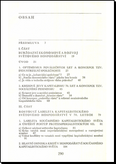 Autor seznamuje s koncepcemi rozvoje světového hospodářství některých buržoazních ekonomů a popisuje hlavní tendence uvnitř kapitalistické světové soustavy ve světle krizí 70. let. Upozorňuje na nové jevy ve světovém hospodářství a přestavbu mezinárodních hospodářských vztahů, konfrontuje pozitivní výsledky hospodářské spolupráce zemí RVHP s vývojem v kapitalistickém světě aj.