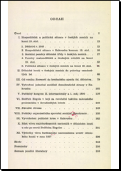 Studie opřená o prameny archivu min. vnitra, o denní tisk a paměti současníků ukazuje v 1. části na hospodářský vývoj kapitalismu, který spěl v Rakousku tehdy rychle k monopolům a trustům. Sociální poměry dělnictva i stř. vrstev se tím kvapně zhoršovaly. V 2. části rýsuje pak oživení dělnického hnutí z mdlob způsobených anarchismem a persekucí v centrech: Brno, Vídeň, Praha. Na rozvoji časopisů i organisací, na sporech o program, organis. řád i ústř. vedení strany sleduje pak jednotl. období vývoje, jak je určovaly sjezdy a konference, místní i celorakouské. Nízká theoretická úroveň způsobila netečnost soc. demokracie k řešení národnostní otázky, zásadního to problému Rakouska. To se jí stalo osudným, neboť mladočeši již od úspěšného 1. máje 1890 se snažili rozštěpit demagogií nacionalismu revol. jednotu děl. třídy. Bezradnost v otázce národnostní, rolnické a j. a rozpad strany v jednotlivé sociálpatriotické strany měly za následek rozkol hnutí a r. 1897 vytvoření strany Klofáčových "národních dělníků", přímé to agentury české buržoasie v děl. hnutí. Tak vznikla nejen základna pro reformismus, nýbrž i živná půda pro oportunismus.