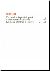 Výbor z veršů starověké básnířky aiolského šlechtického původu, žijící asi před půl třetím tisíciletím na Lesbu, básnířky, jejíž poezie ovlivnila řeckou a římskou literaturu na více než jedno tisíciletí a která byla již ve starověku uctívána jako desátá Múza. Verše skládané k doprovodu strunného nástroje, jejichž námětem jsou mládí a krása, jako hlavní ozdoba ženy, a zejména pak láska, a to nejen milostná láska k muži, ale i k ženě.
