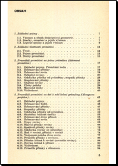 Přehled zobrazovacích metod deskriptivní geometrie vypovídá o vlastnostech promítání a pojednává o pravoúhlém promítání na jednu průmětnu (kótovaném) a na dvě k sobě kolmé průmětny (Mongeově projekci), o mnohostěnech a oblýchtělesech a jejich řezech, sítích i průnikových variacích, o kuželosečkách, kosoúhlém promítání a pravoúhlé axonometrii. Výklad je provázen hojnými příklady; kromě úloh v textu samém, u nichž je hned zveřejněno řešení, má kniha155 cvičebních úkolů.