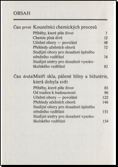 Informacím o učebních oborech, středním odborném a vysokoškolském vzdělání v oboru chemie, skla, hrnčířství a bižuterie, předchází vyprávění o tradicích, současném stavu a perspektivách těchto oborů. Autor také seznamuje se středními školami pro pracující, s možnostmi studia na průmyslovkách po dokončení učebního oboru, se studiem na vysokém učení technickém aj.