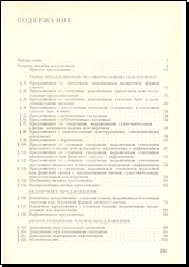 Příručka pro seminární a praktickou výuku skladby současného ruského jazyka je uspořádána systémem, jenž je obvyklý pro učebnice syntaxe na vysokých školách v SSSR. Probírá typy vět přísudkových, věty bezpodmětné, rozvíjejícívětnéčleny, volně připojované větné členy, složené věty, různé souřadné vztahy a způsoby jejich vyjádření, podřadná souvětí.